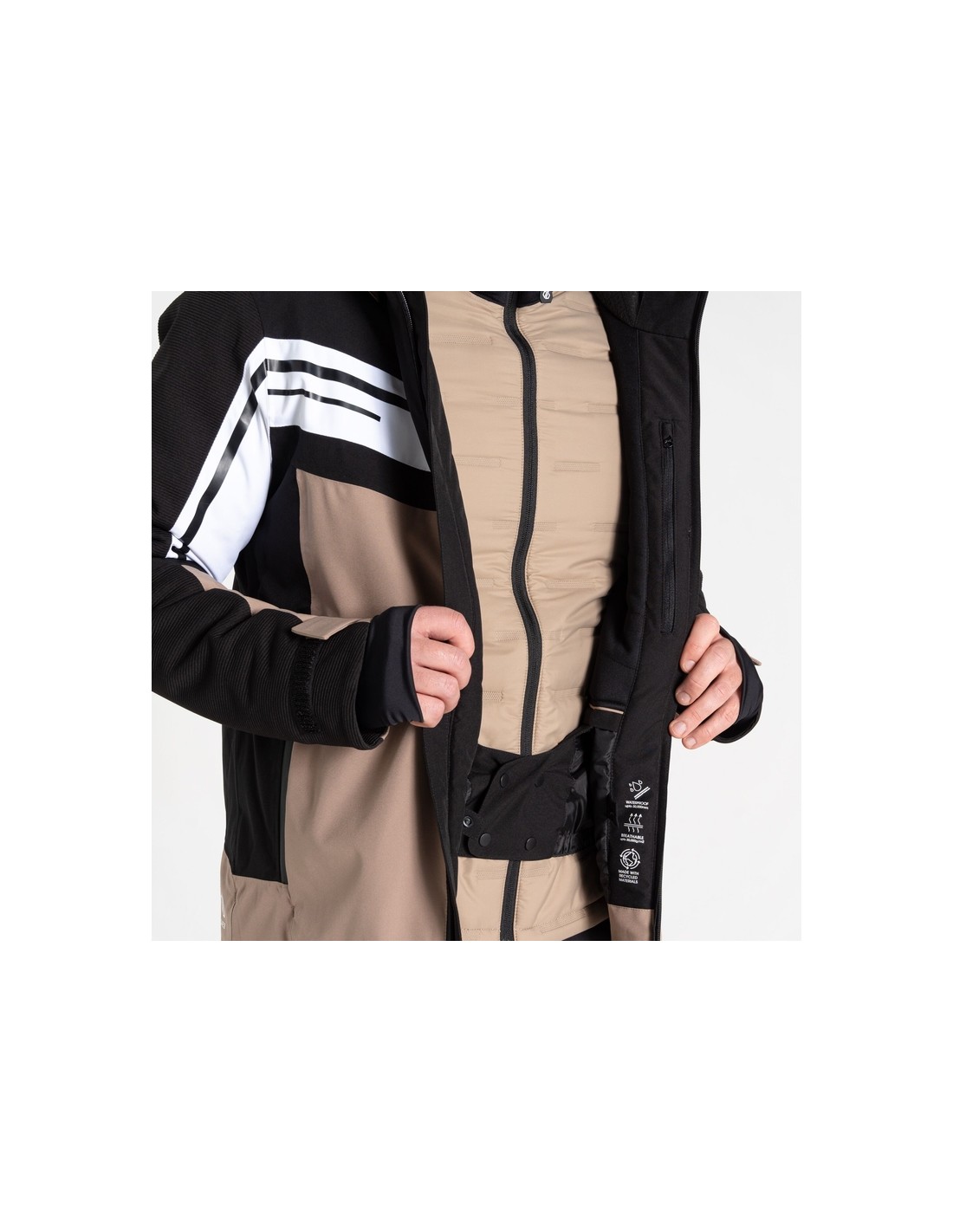 - Veste intérieure entièrement zippée hybride avec déflecteurs thermoscellés à l'avant et à l'arrière mélangés avec des manches extensibles et x2 poches inférieures zippées dissimulées